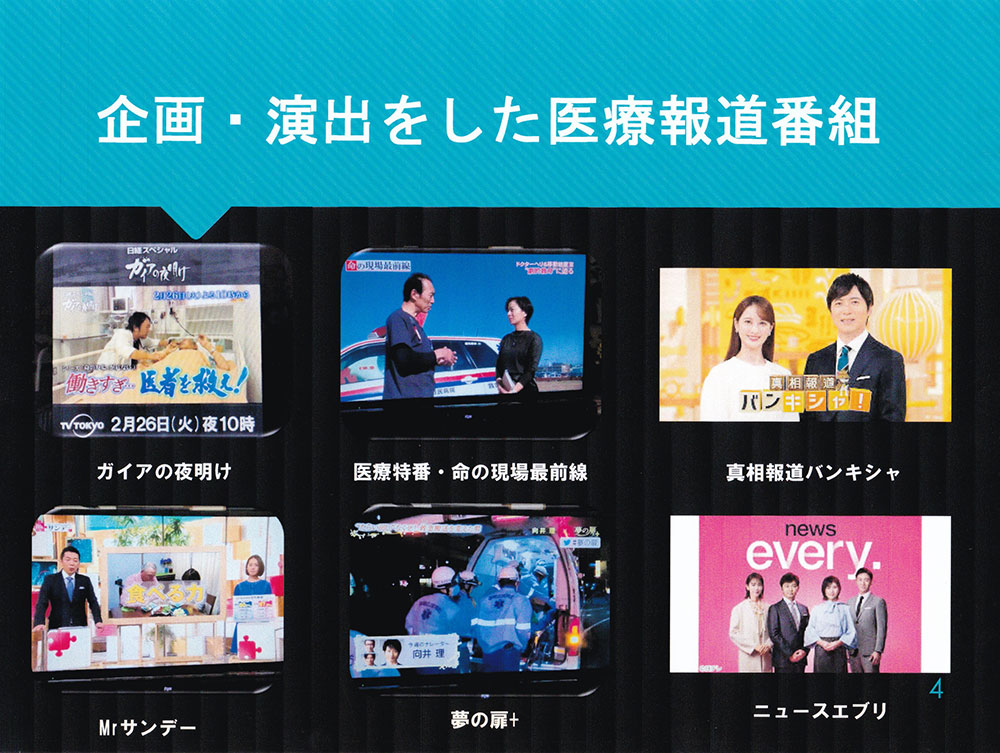 ★ニュースエブリ・真相報道バンキシャ、ミスターサンデー、ガイアの夜明けなどの報道・ドキュメンタリー番組で、「救急医療」「高齢者医療」「口腔医療」など多岐に渡るテーマで、医療情報を発信中。